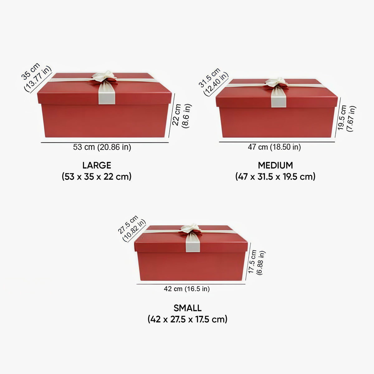 | GIFTBOX00699 | Small - 42 x 27.5 x 17.5 cm (16.5 x 10.82 x 6.88 inch) Medium - 47 x 31.5 x 19.5 cm (18.50 x 12.40 x 7.67 inch) Large - 53 x 35 x 22 cm (20.86 x 13.77 x 8.66 inch) |