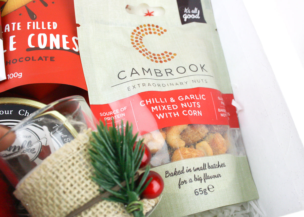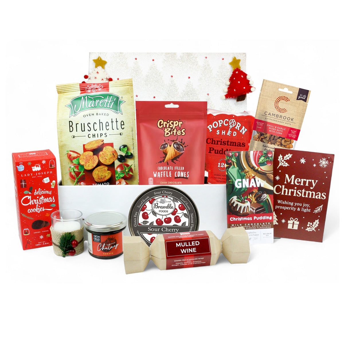 - šæ Sweet + Savoury Celebration: Includes festive popcorn, bruschette crisps, chocolate-filled waffle cones, crunchy nuts & buttery cookies for every taste preference.