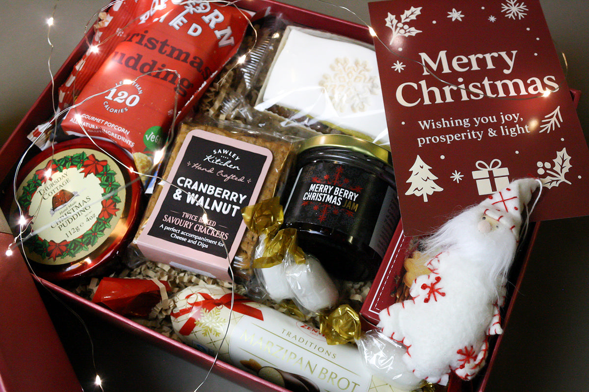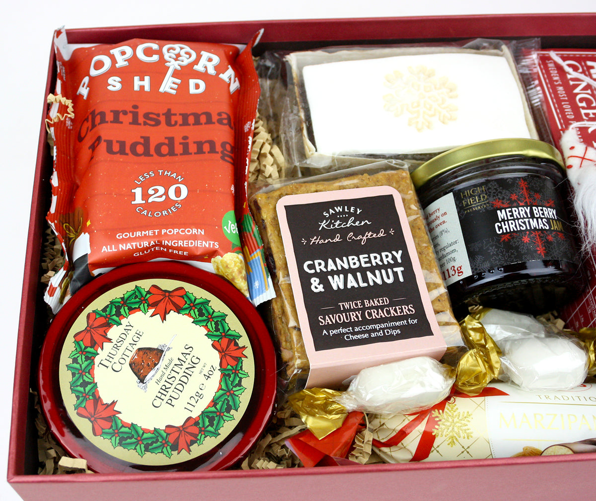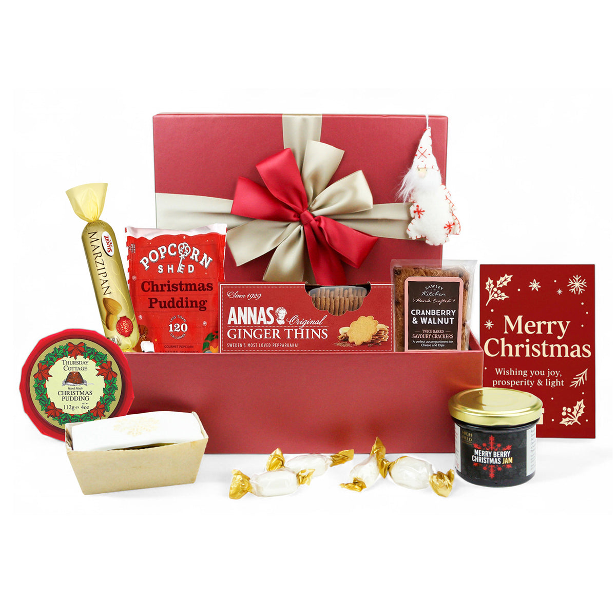 • 🧺 Includes a Delicious Selection Of: Seasonal ginger biscuits, festive popcorn, marzipan, rich Christmas pudding, savoury fruit crackers, luxury jam & classic wrapped sweets.
