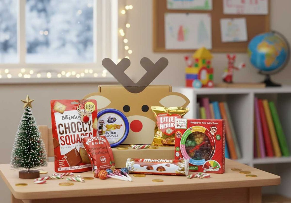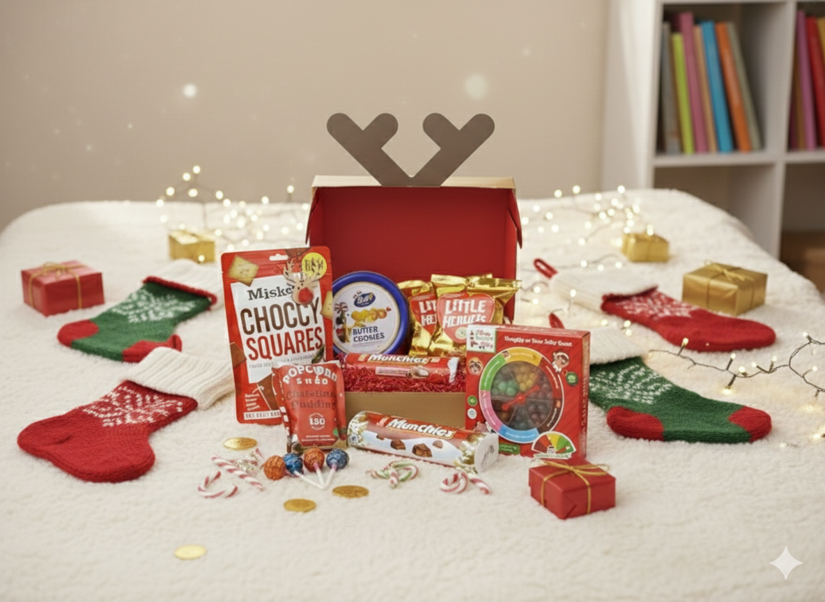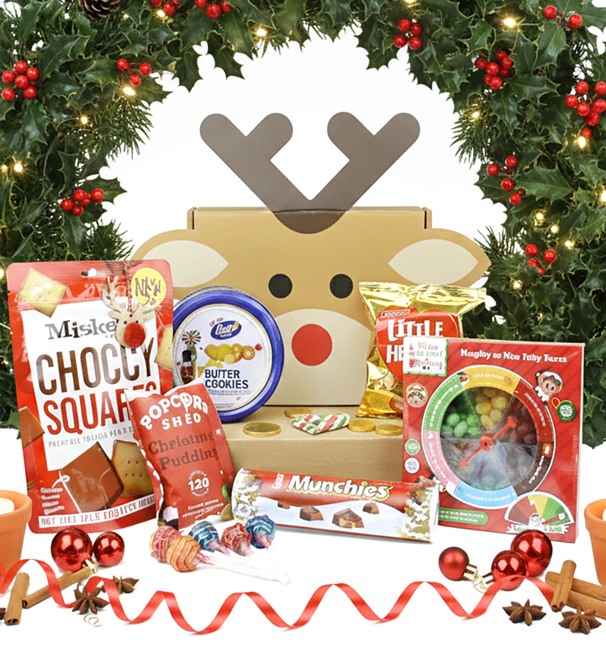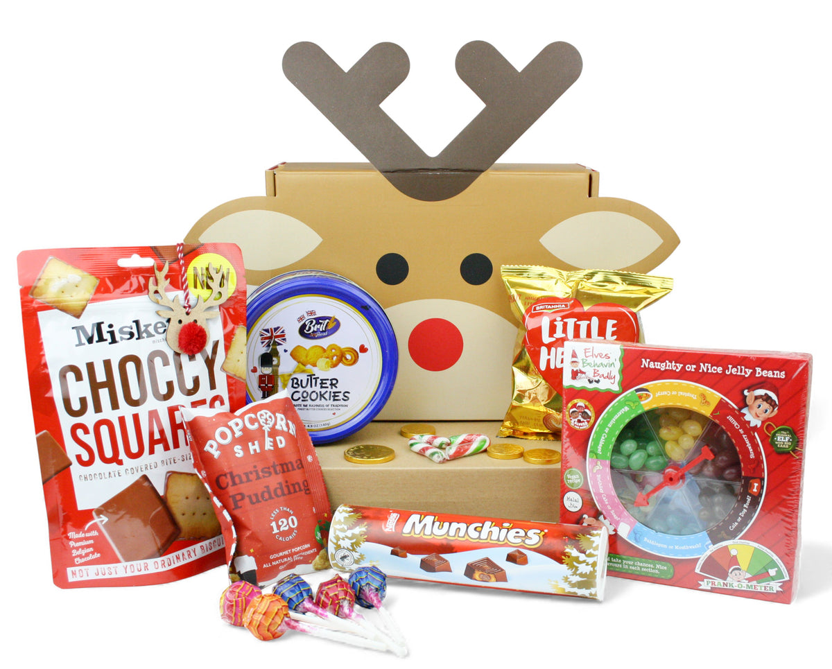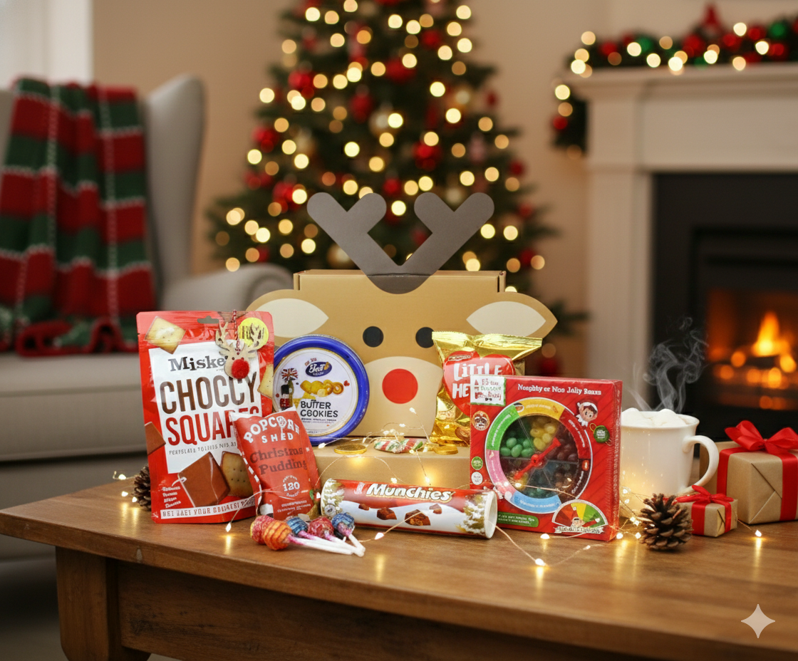 - 🦌 FUN REINDEER CHRISTMAS HAMPER – A playful festive gift box designed especially for kids, featuring a cute reindeer design filled with delicious sweets, biscuits, treats and holiday surprises.