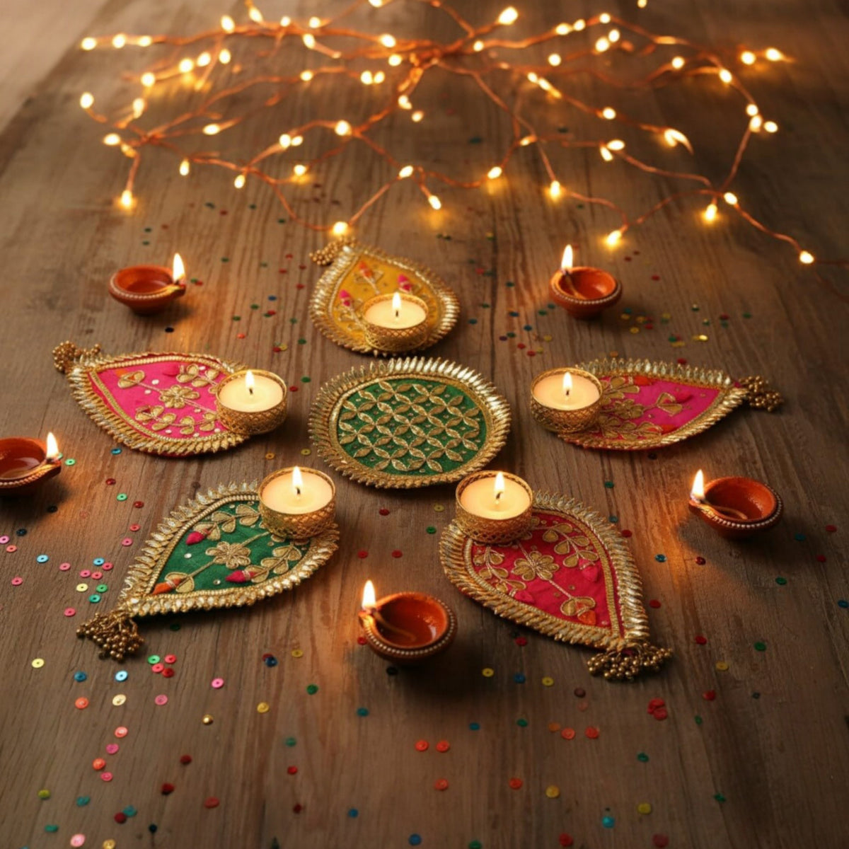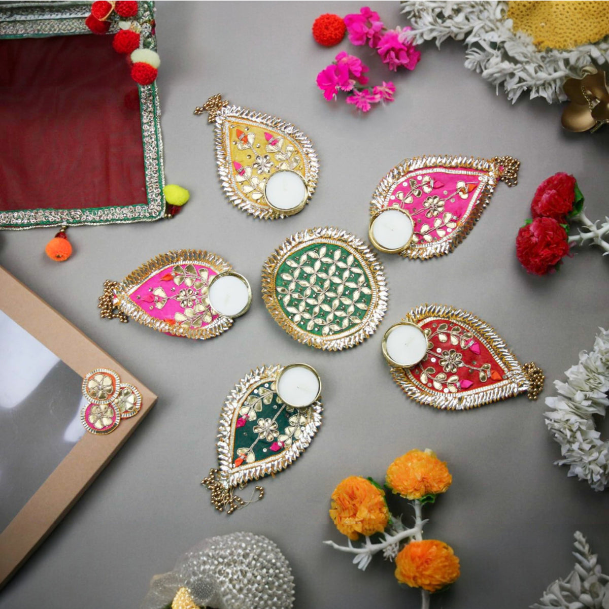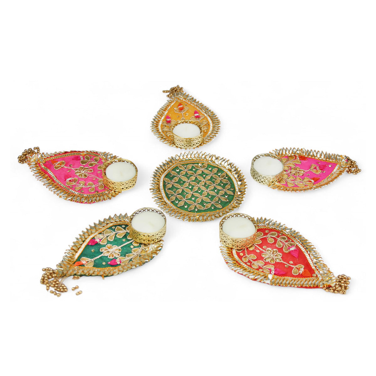 - 🪔 Set of 6 Gota Rangoli Tea Light Candle Holders – Ethnic decorative design with intricate gota work on vibrant patterns, perfect for a bright festive look