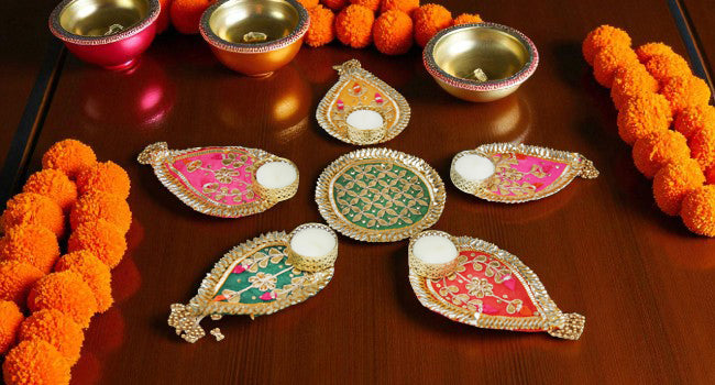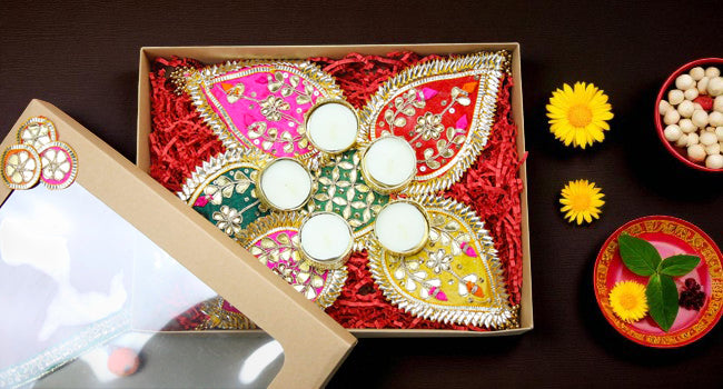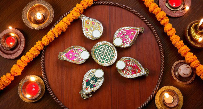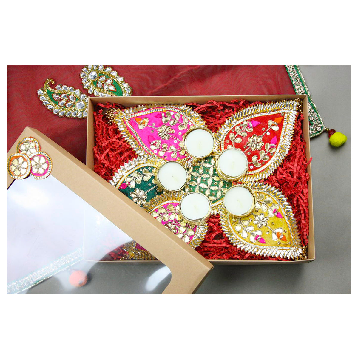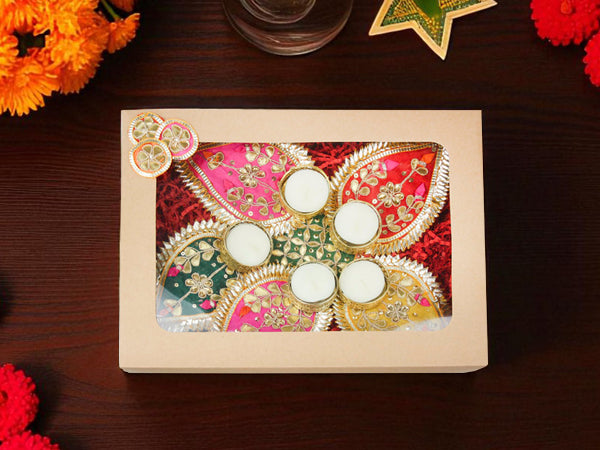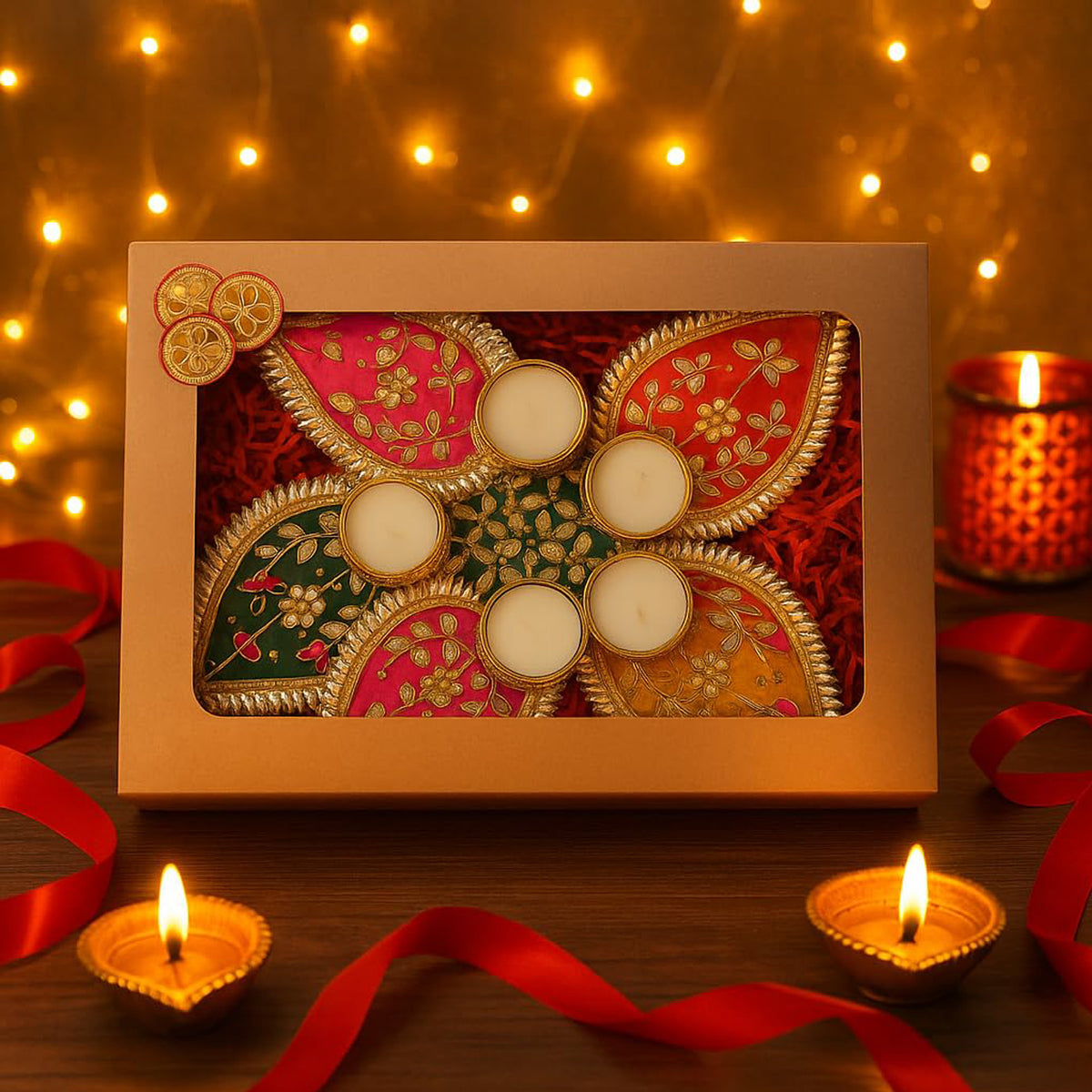 - 🪔 Set of 6 Gota Rangoli Tea Light Candle Holders – Ethnic decorative design with intricate gota work on vibrant patterns, perfect for a bright festive look