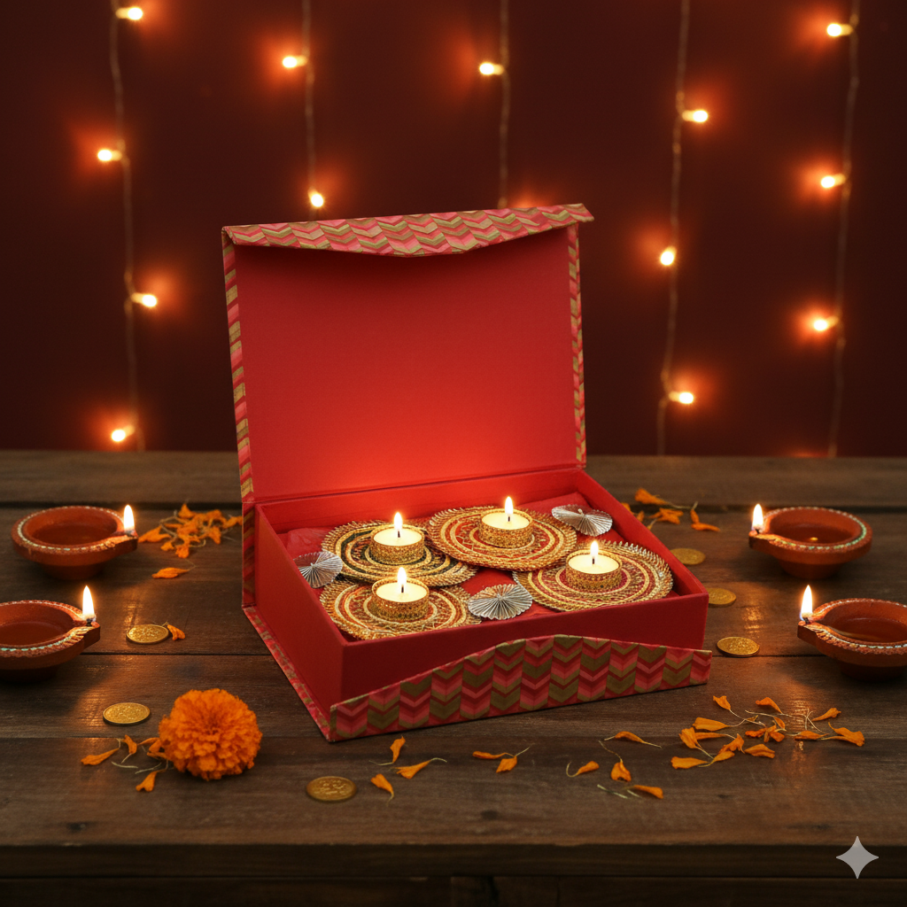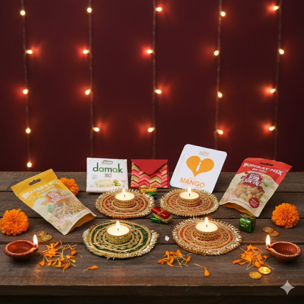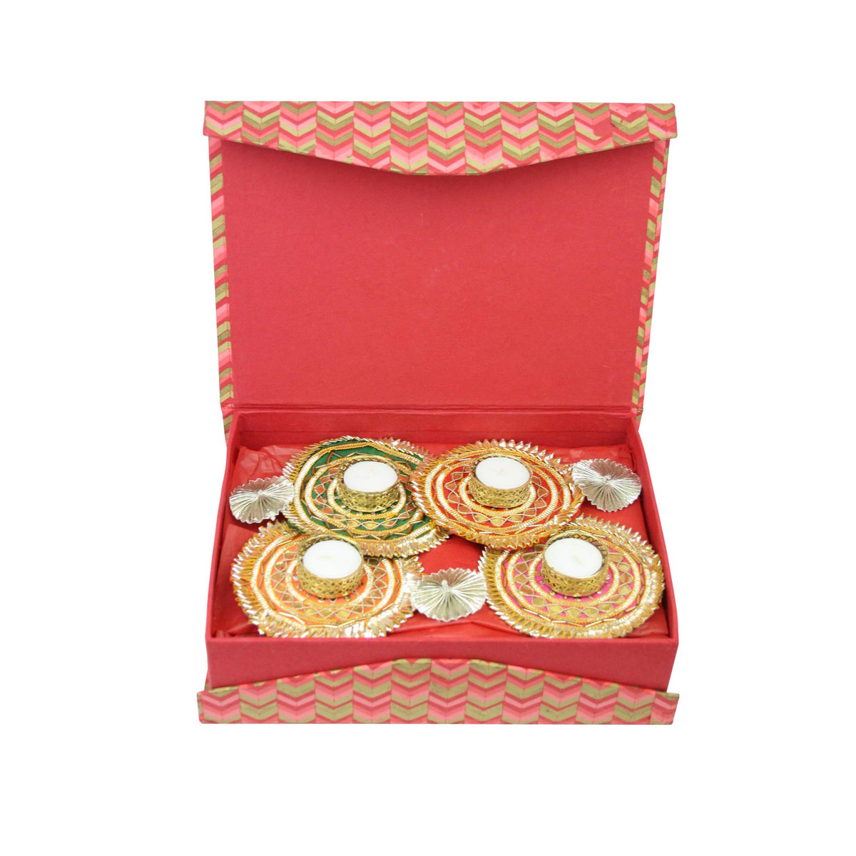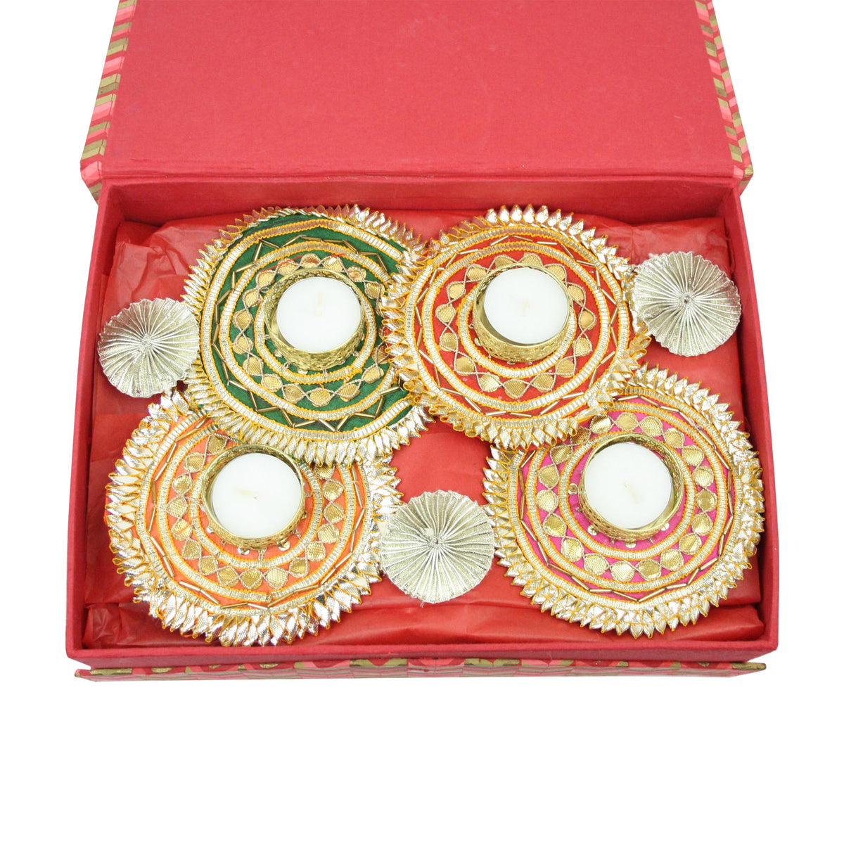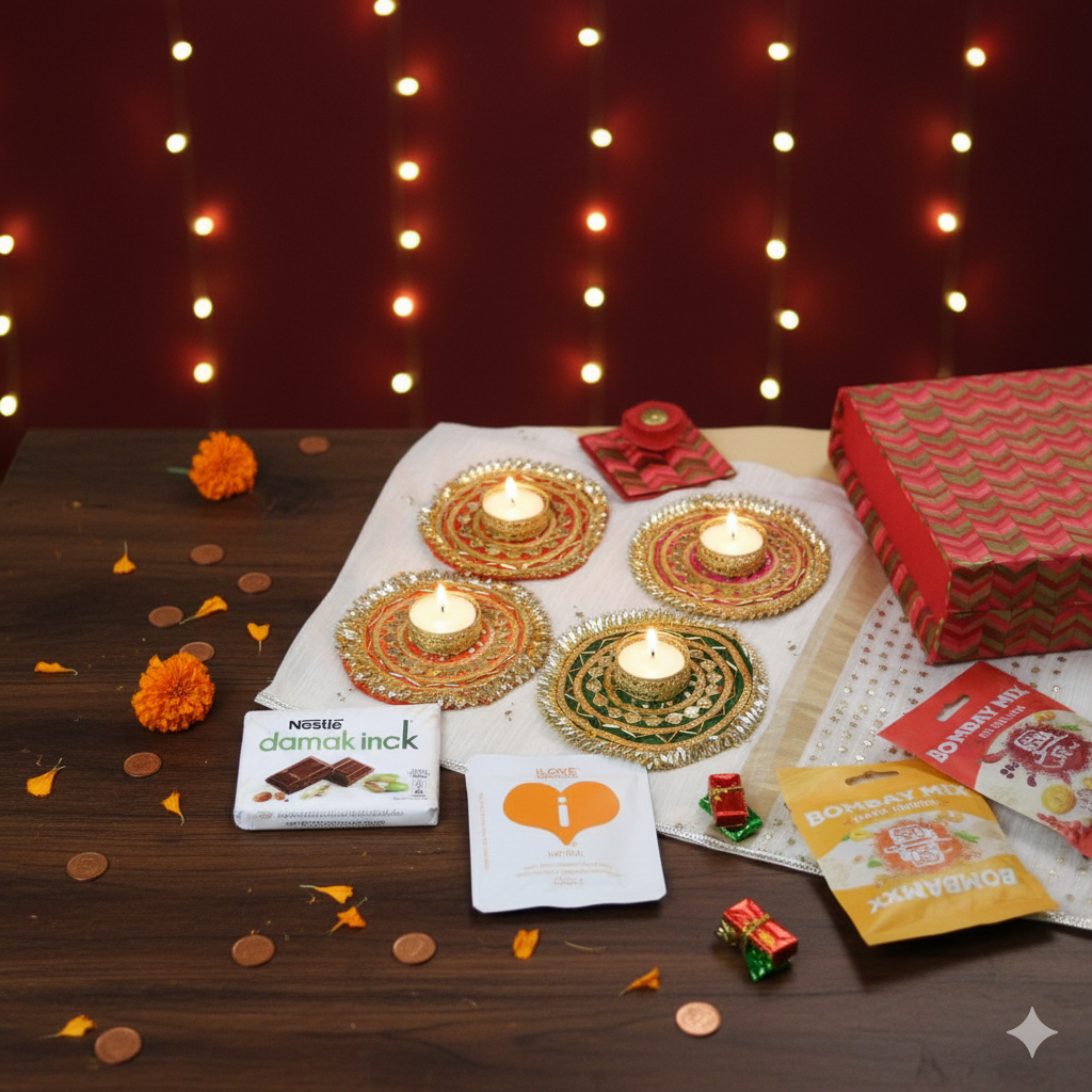 Set of 4 Rangoli Gota Diya Tea Light Candles & Diwali Snacks Gift Hamper