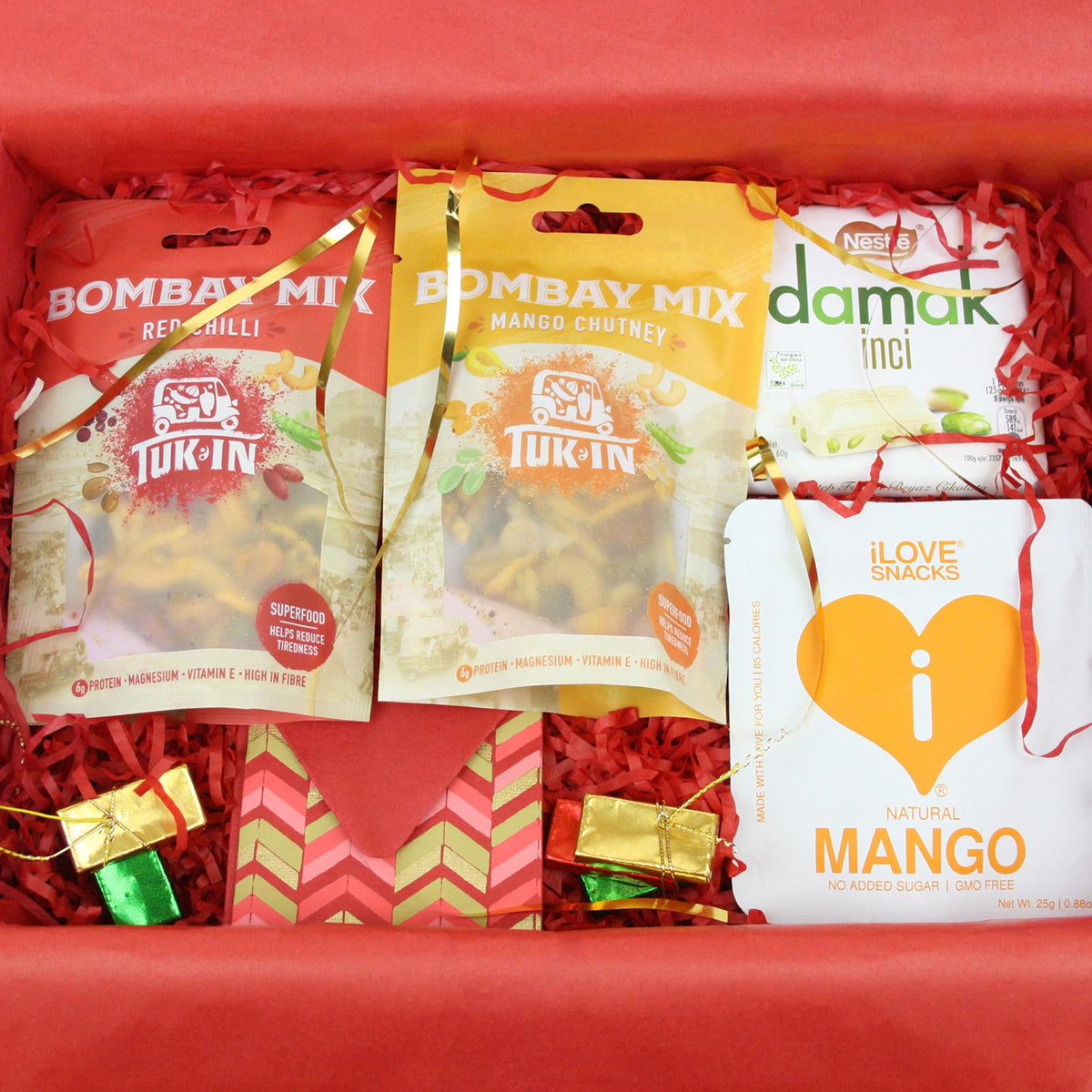 - 🎁Festive Sweets & Savories: Bombay Mix Snacks (Red Chilli & Mango Chutney Flavour) - one fiery, crunchy snack mix and another sweet, tangy twist. Damak White Chocolate with Pistachios - luxurious Turkish delight & I Love Snacks Natural Mango Slices - Healthy, guilt-free sun-ripened dried mango slices.