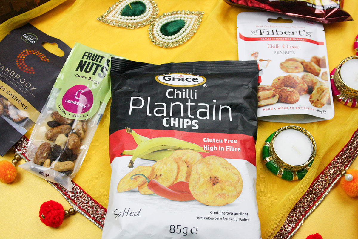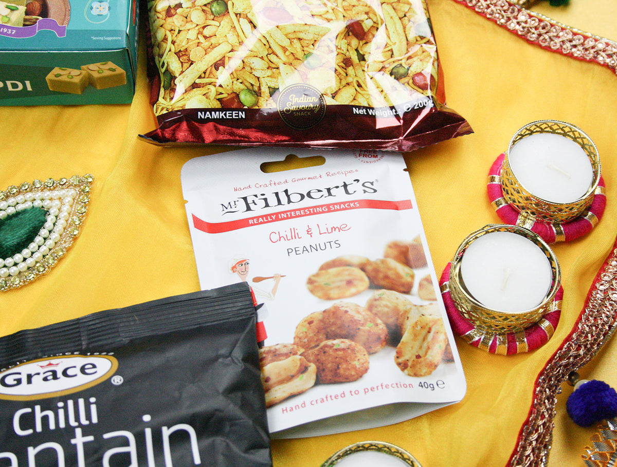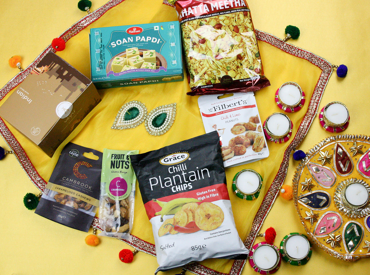 - 🎁What's Inside: Includes Indian masala chai sachets, 1 soan papdi (250g), 1 khatta meetha (200g), 1 chili & lime peanuts, 1 caramelized cashews (45g), 2 mini fruit & nut pouches (25g each), 1 chilli plantain chips (85g), and set of 7 decorative gota tealight candles.
