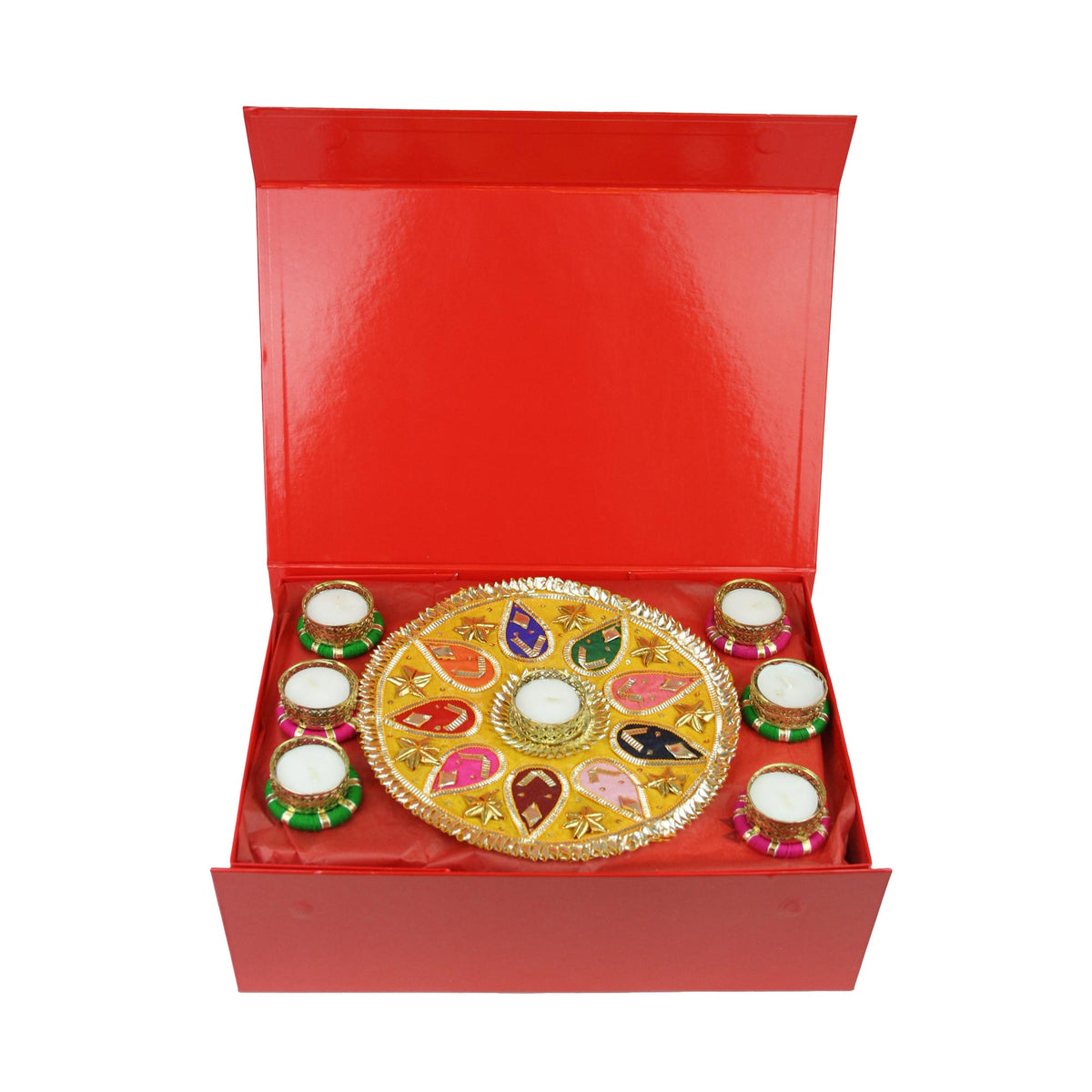 Set of 7 Traditional Gota Rangoli Gota Diya Tea Light Candles & Diwali Snacks Gift Hamper