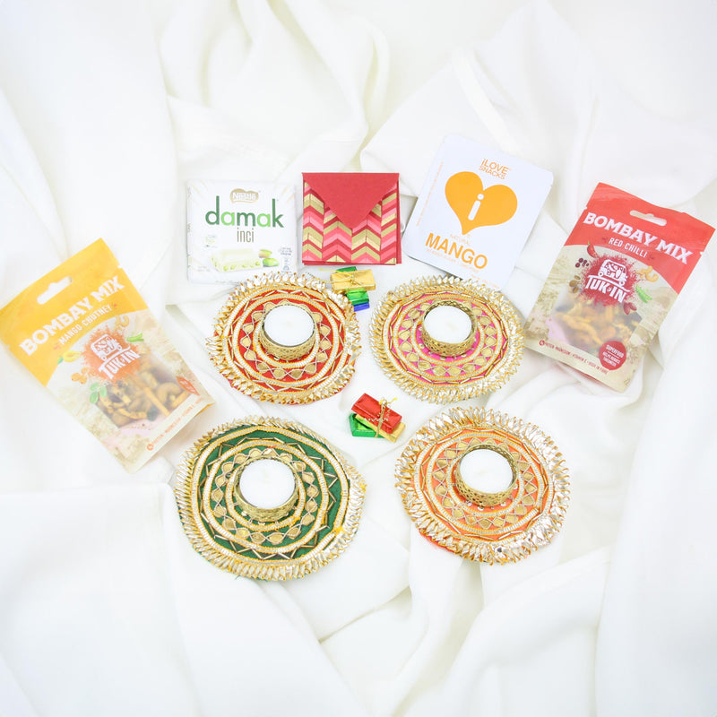 Set of 4 Rangoli Gota Diya Tea Light Candles & Diwali Snacks Gift Hamper