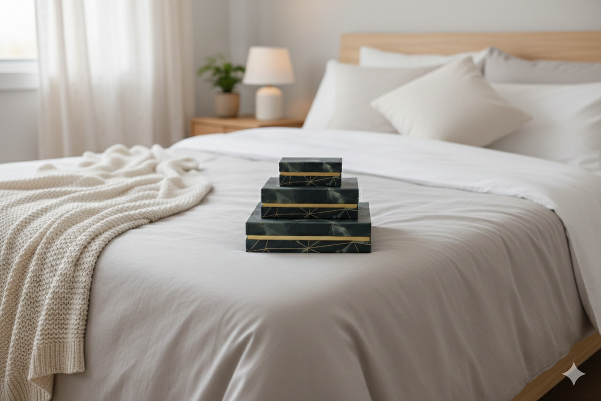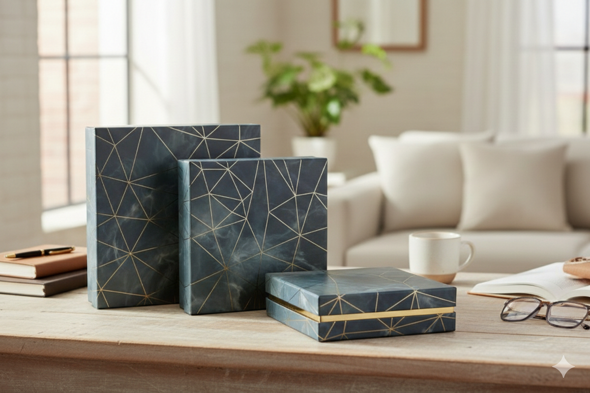 • Sophisticated Marble Design: Each box features a refined marble print enhanced by subtle golden geometric lines, offering a luxurious and contemporary look.