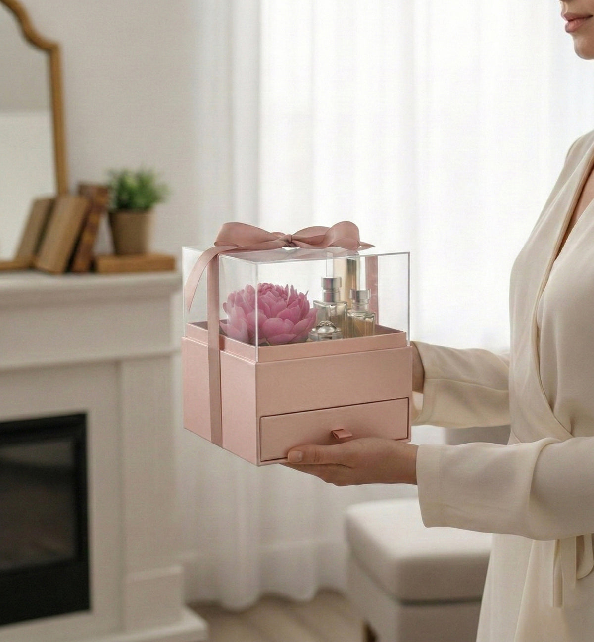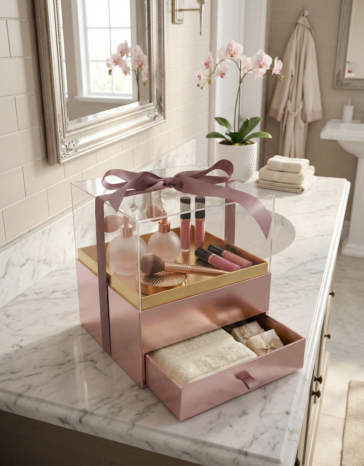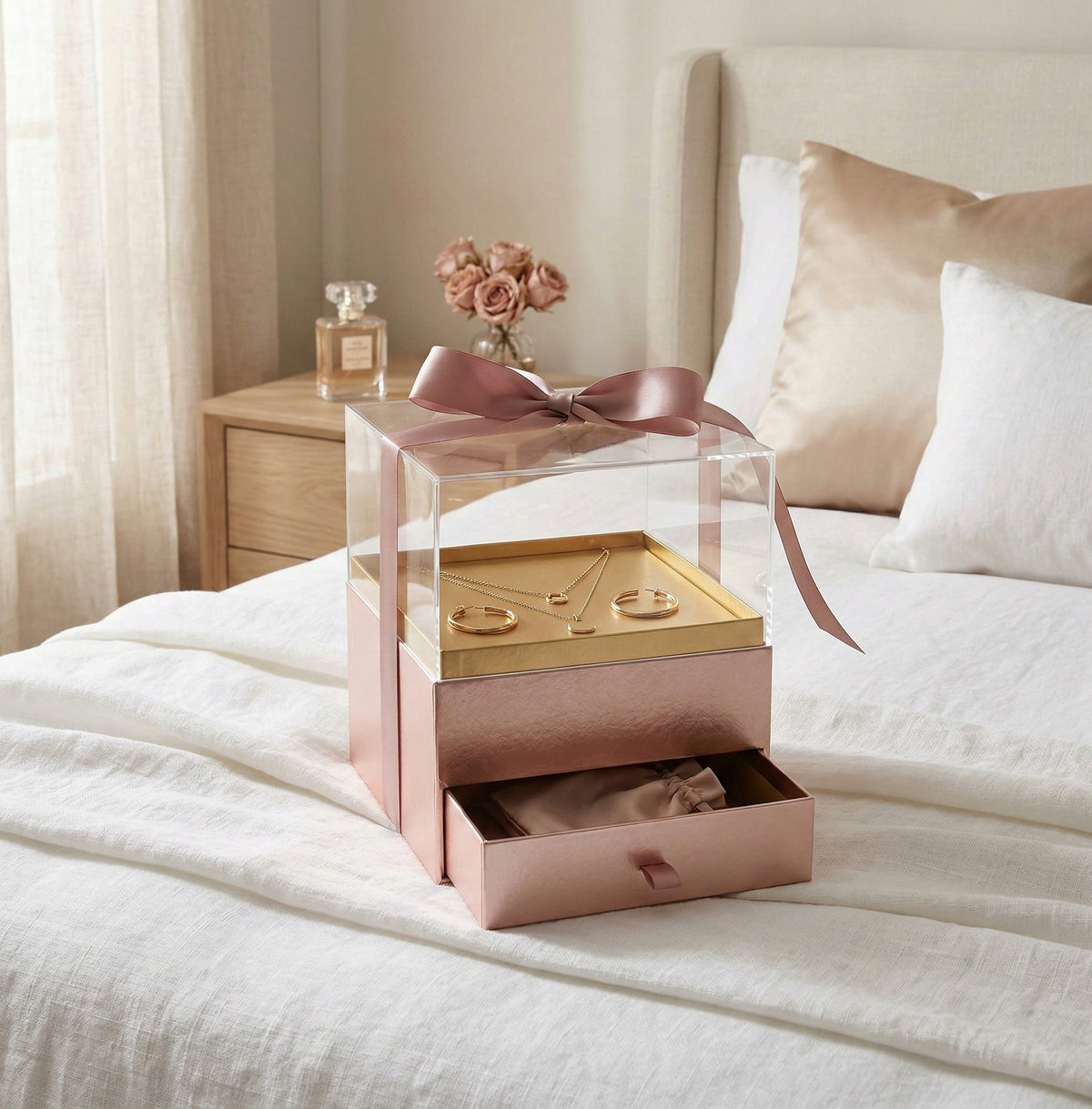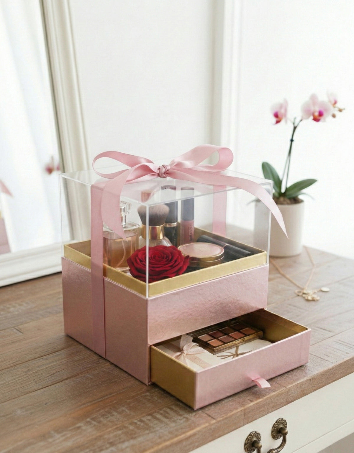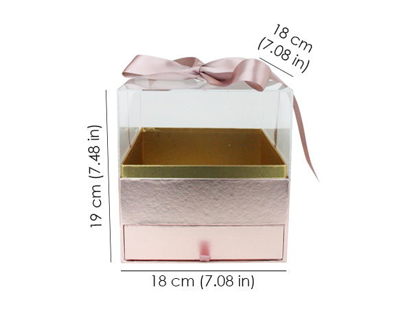 Elegant Clear Lid Gift Box with Ribbon and Drawer for Special Occasions - Pink/Gold