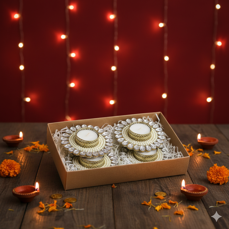 Set of 4 Rhinestone Tea Light Candle Diwali Gift Hamper