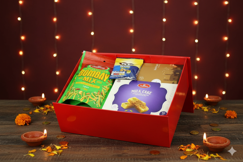 Set of 7 Traditional Gota Rangoli Gota Diya Tea Light Candles & Diwali Snacks Gift Hamper