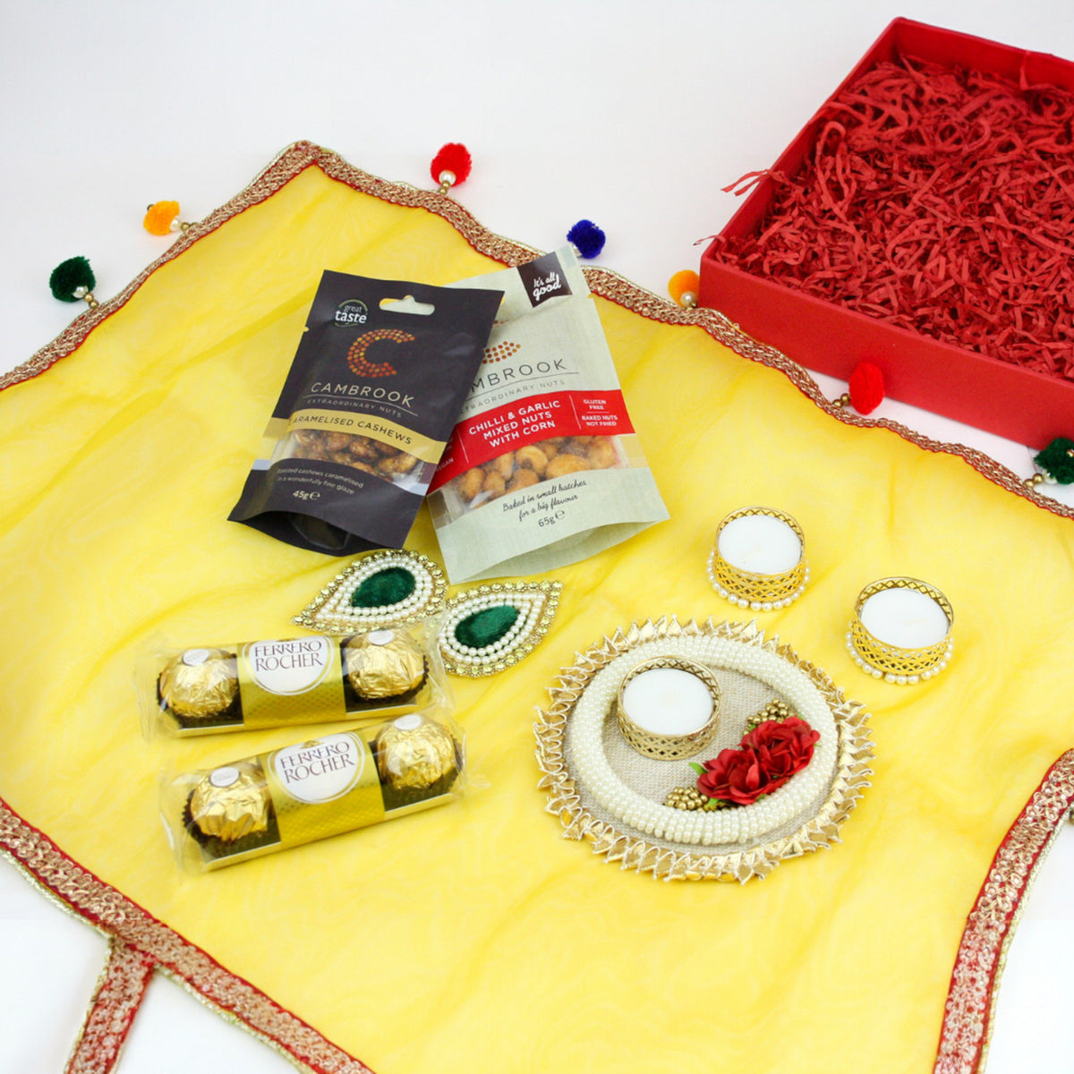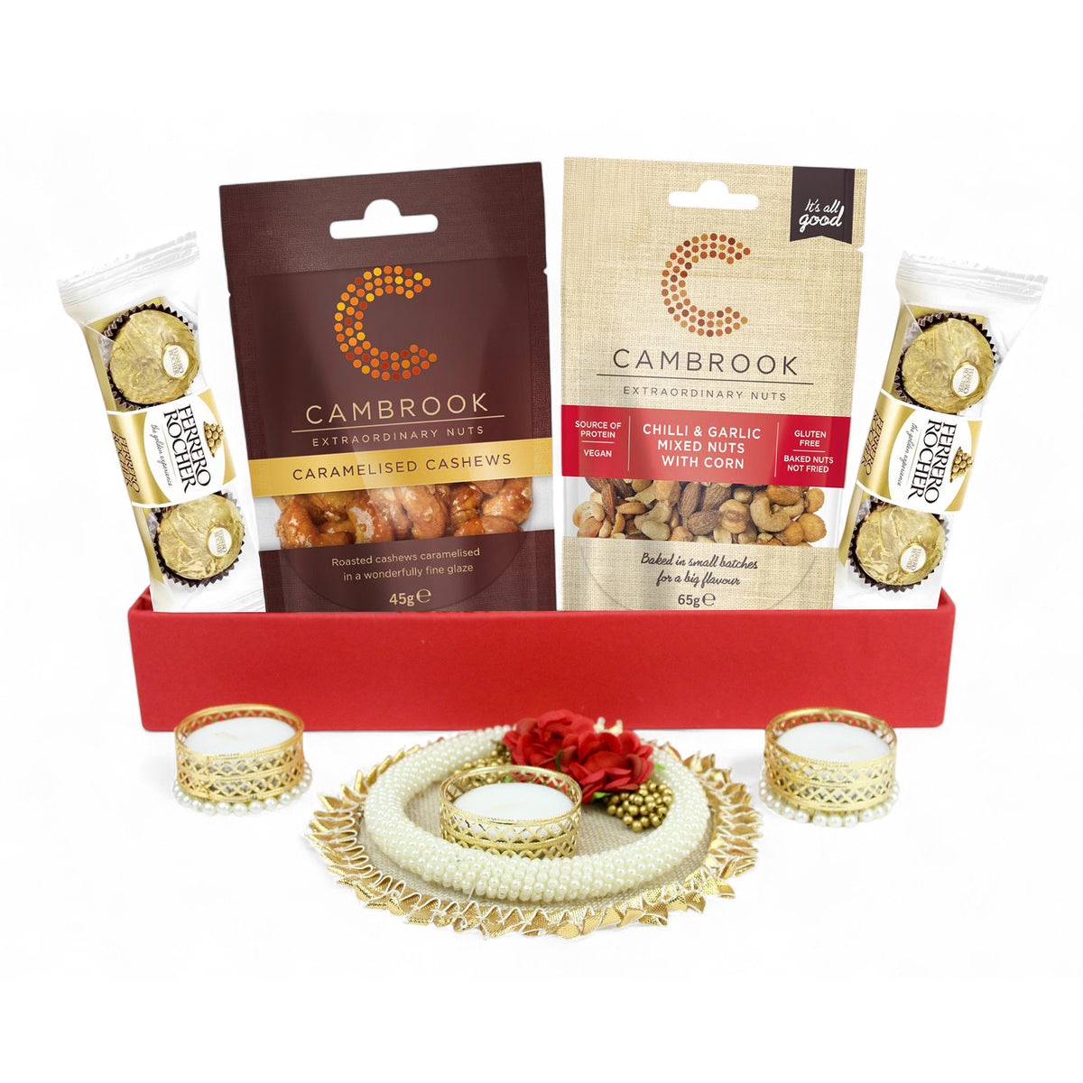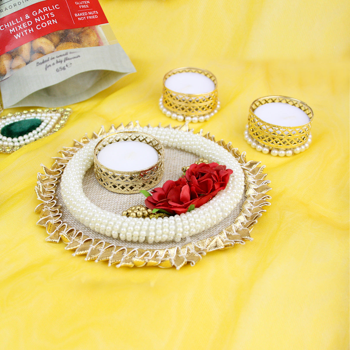 Diwali Gift Hamper with Festive Pearl Tea Light Candle,Snacks & Chocolatesâ Perfect for Gifting