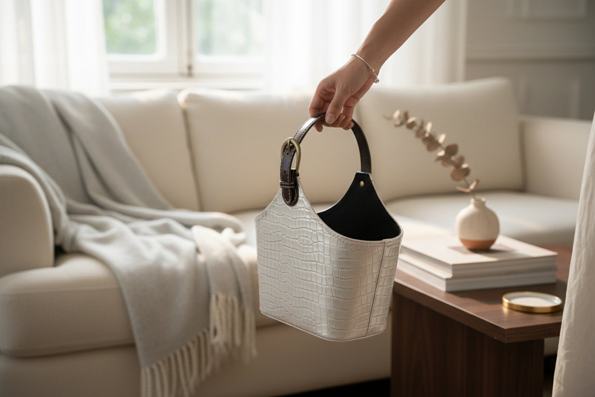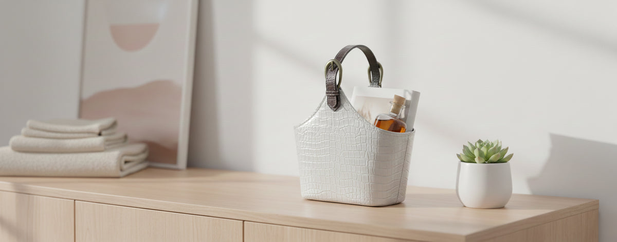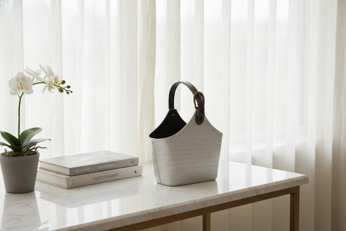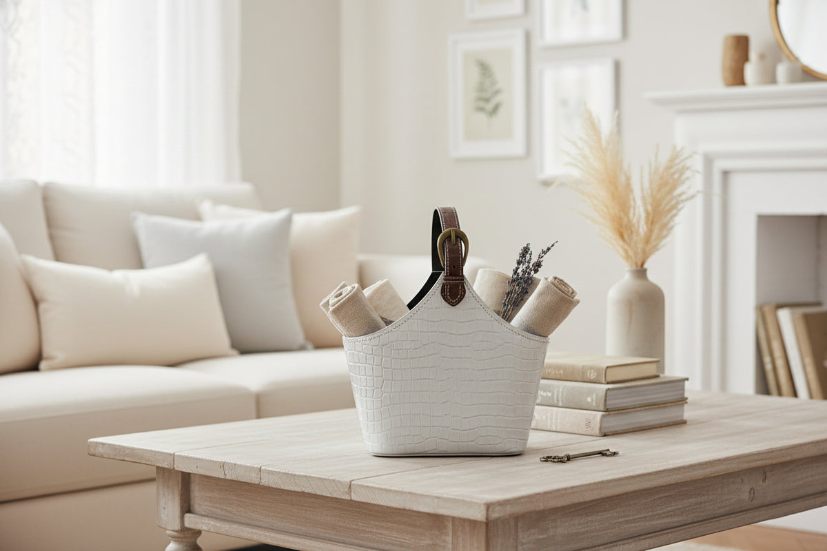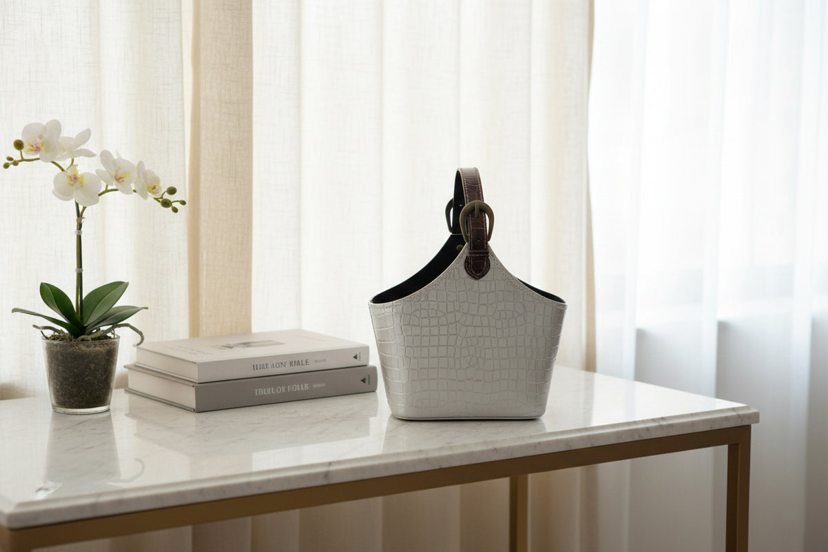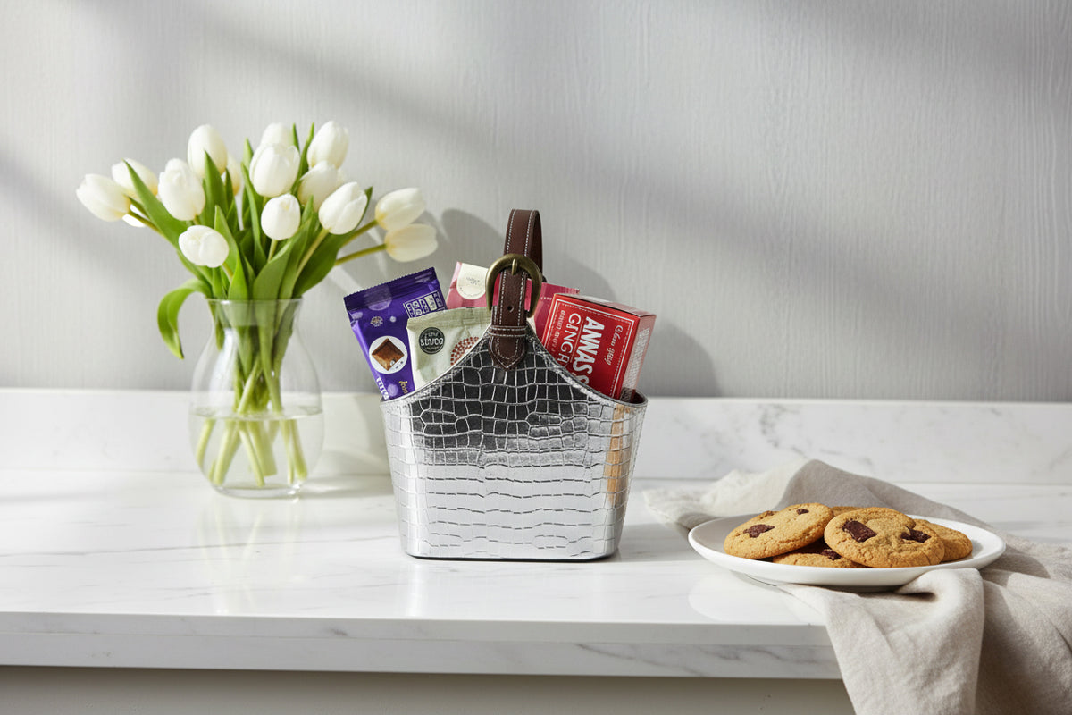 - 🪩 Premium Silver Croc Texture Finish: Stylish faux-leather basket with an embossed crocodile pattern, offering a modern and luxurious look for hampers, gifting, and home decor.