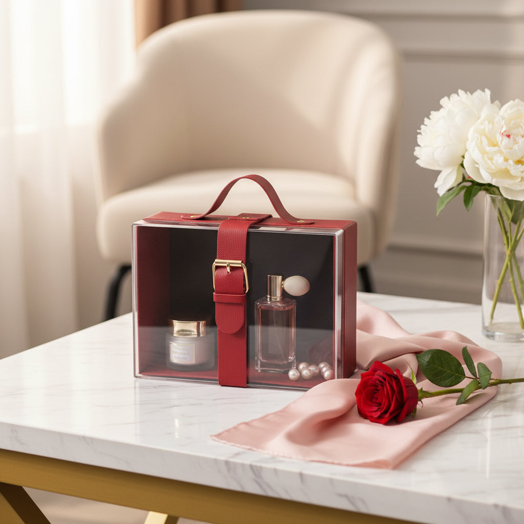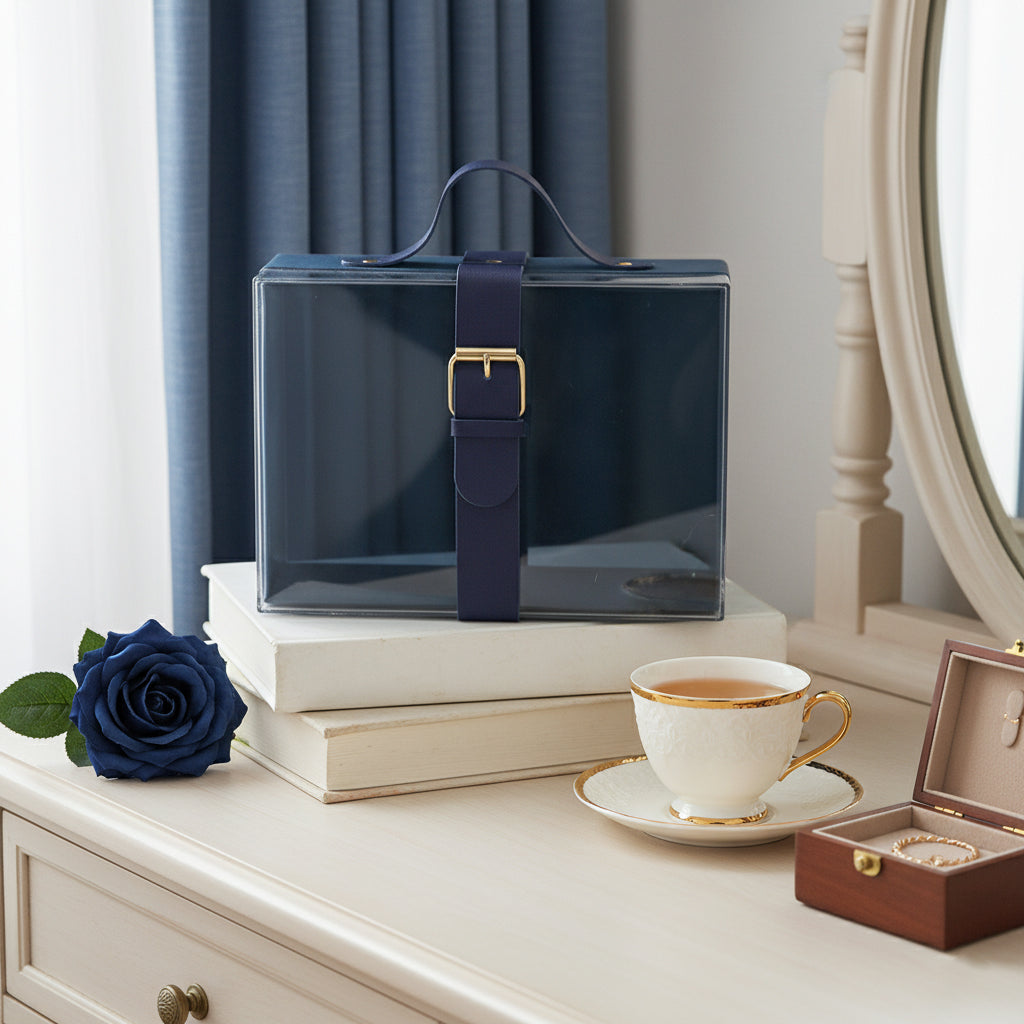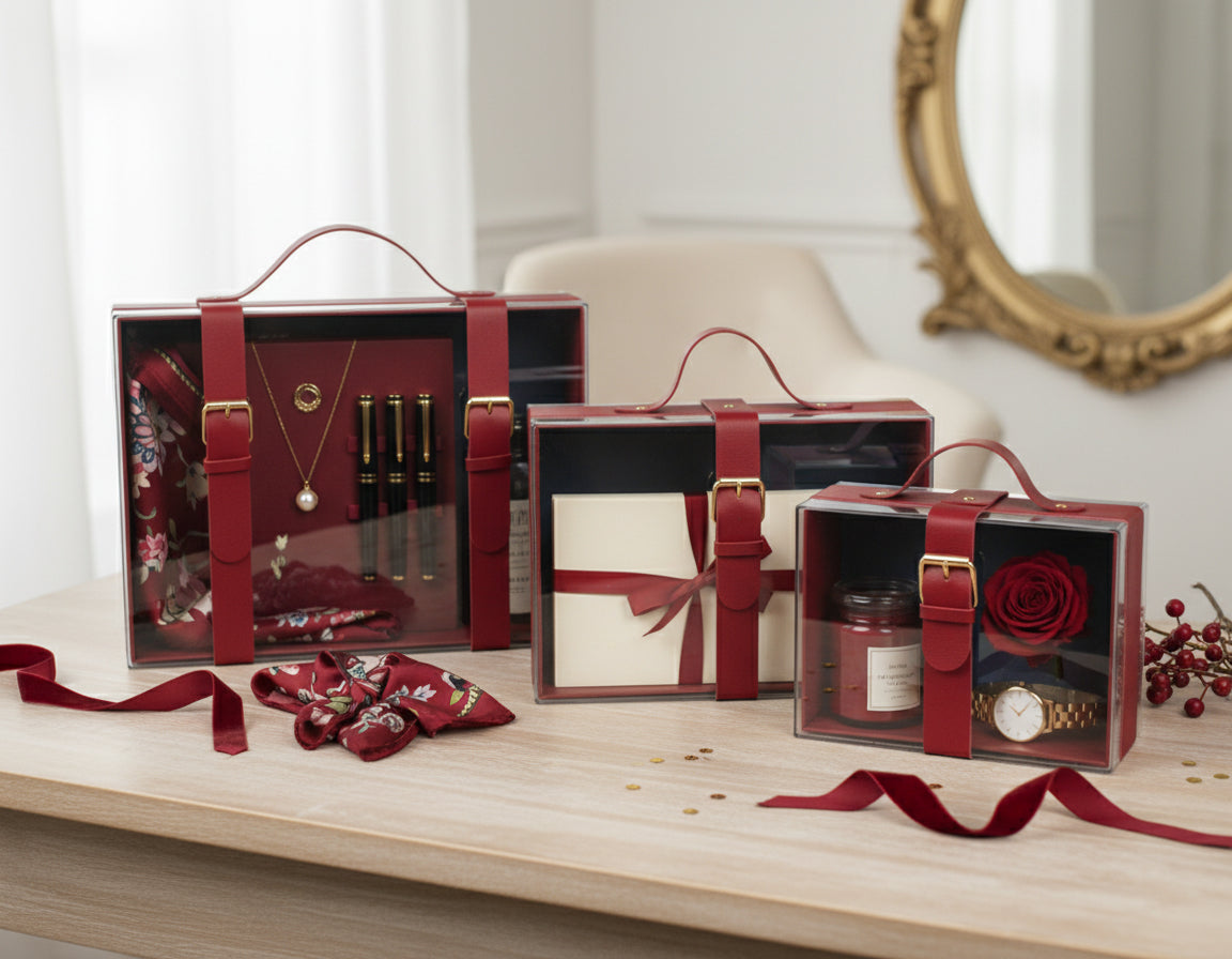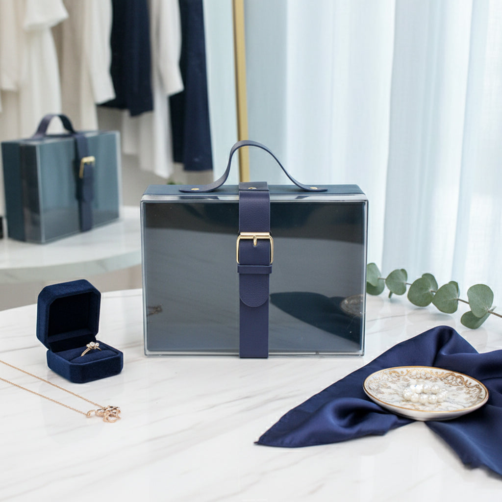 - ✨ Modern Transparent Design – Rigid clear gift boxes with sleek PU leather straps and gold buckles for a luxury presentation.