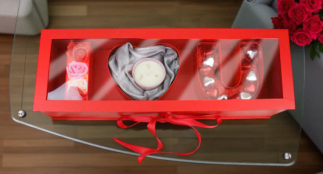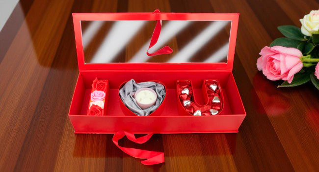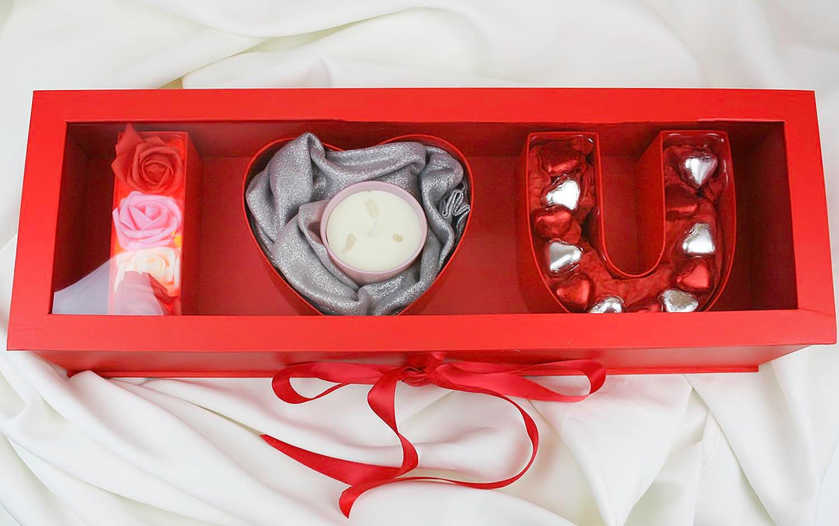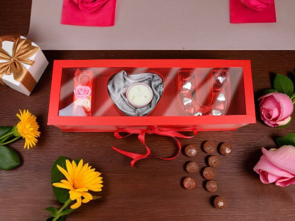 Luxury Gift Hamper Box with Candle, Roses, and Heart-Shaped Chocolates - I Love You