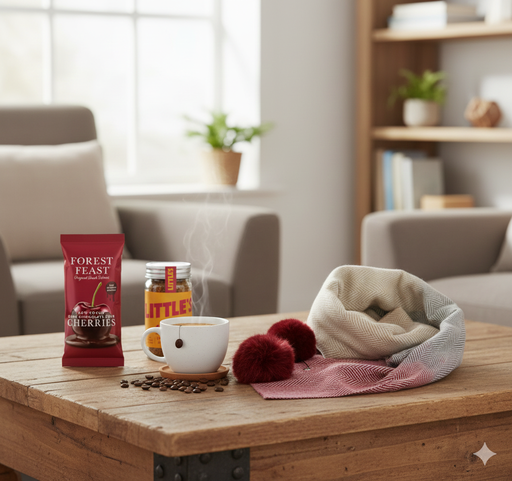 - 🎁 Luxurious velvet reusable gift box, Stylish smart Scarf , Little's creamy caramel Coffee and Dark Chocolate Sour Cherries