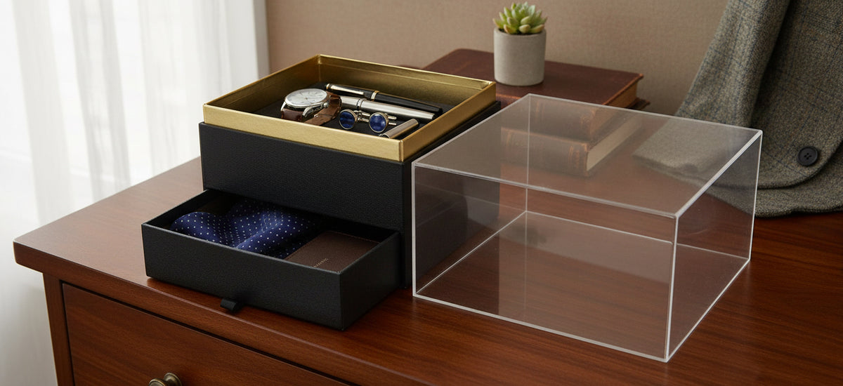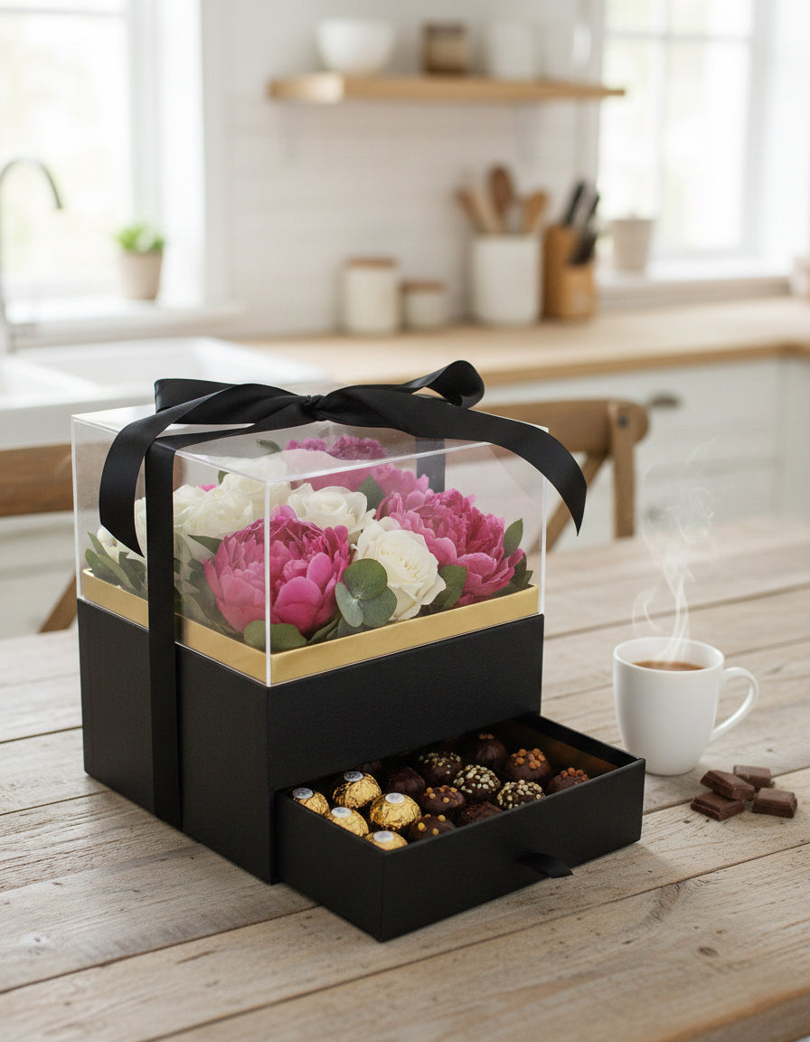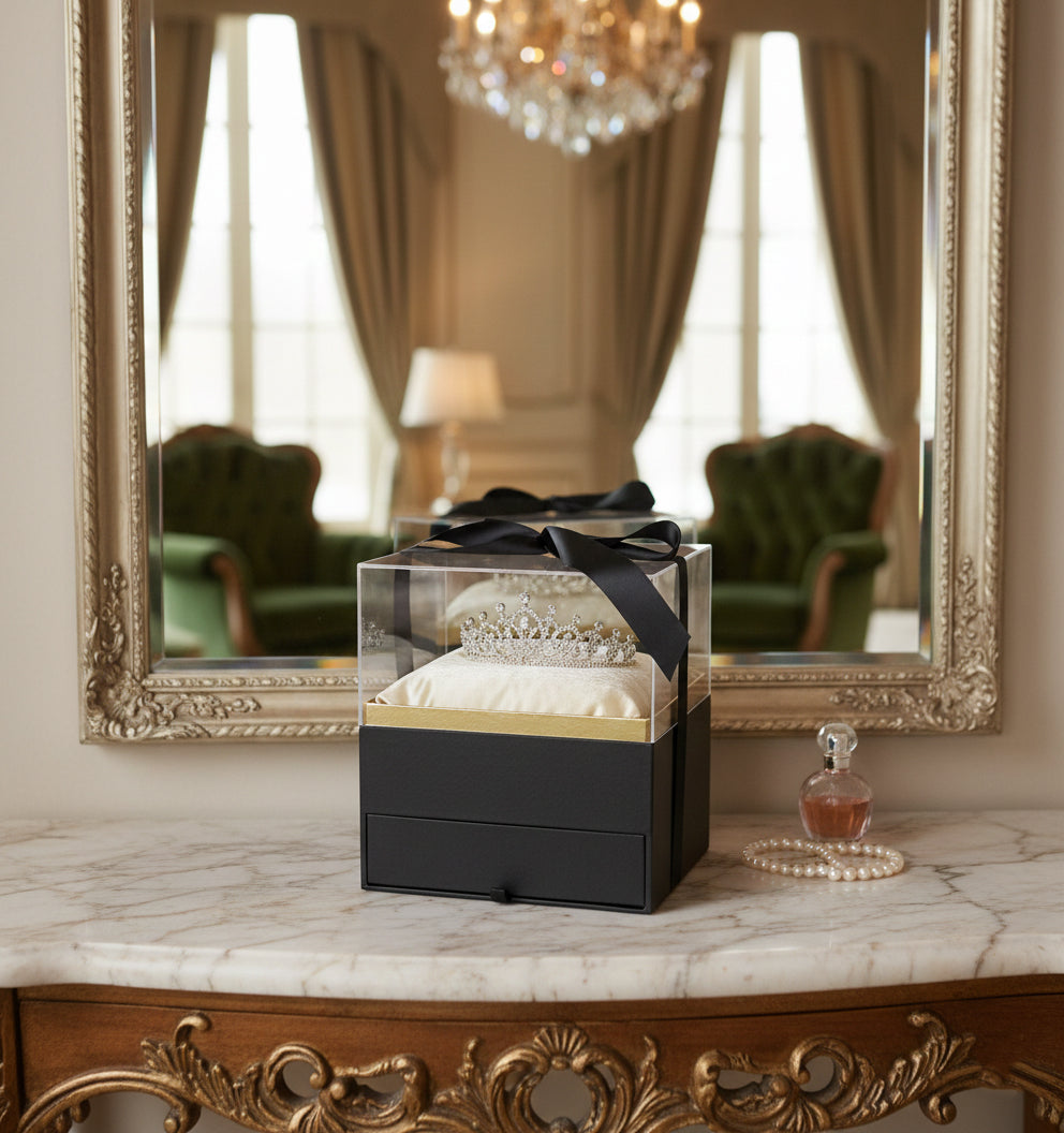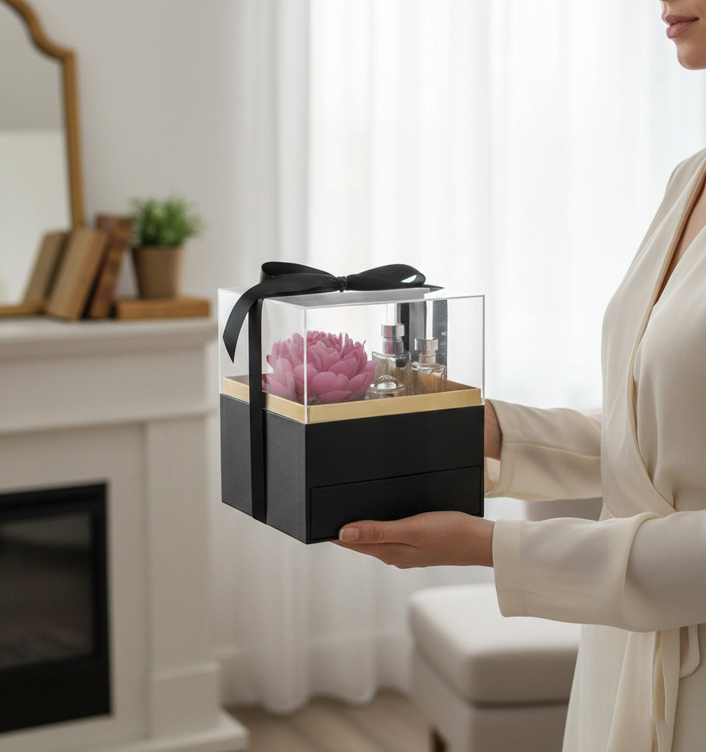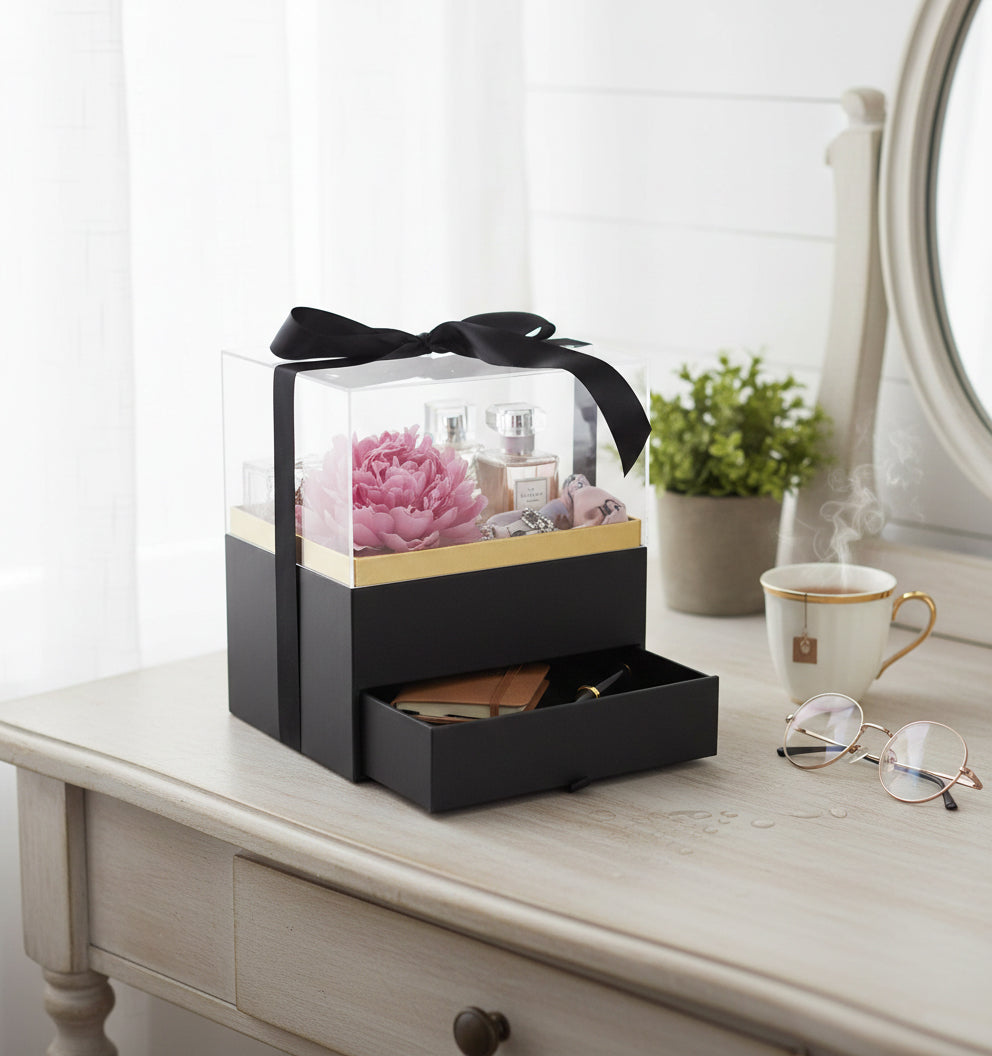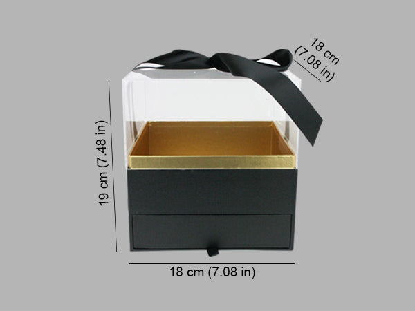 Elegant Clear Lid Gift Box with Ribbon and Drawer for Special Occasions - Black/Gold